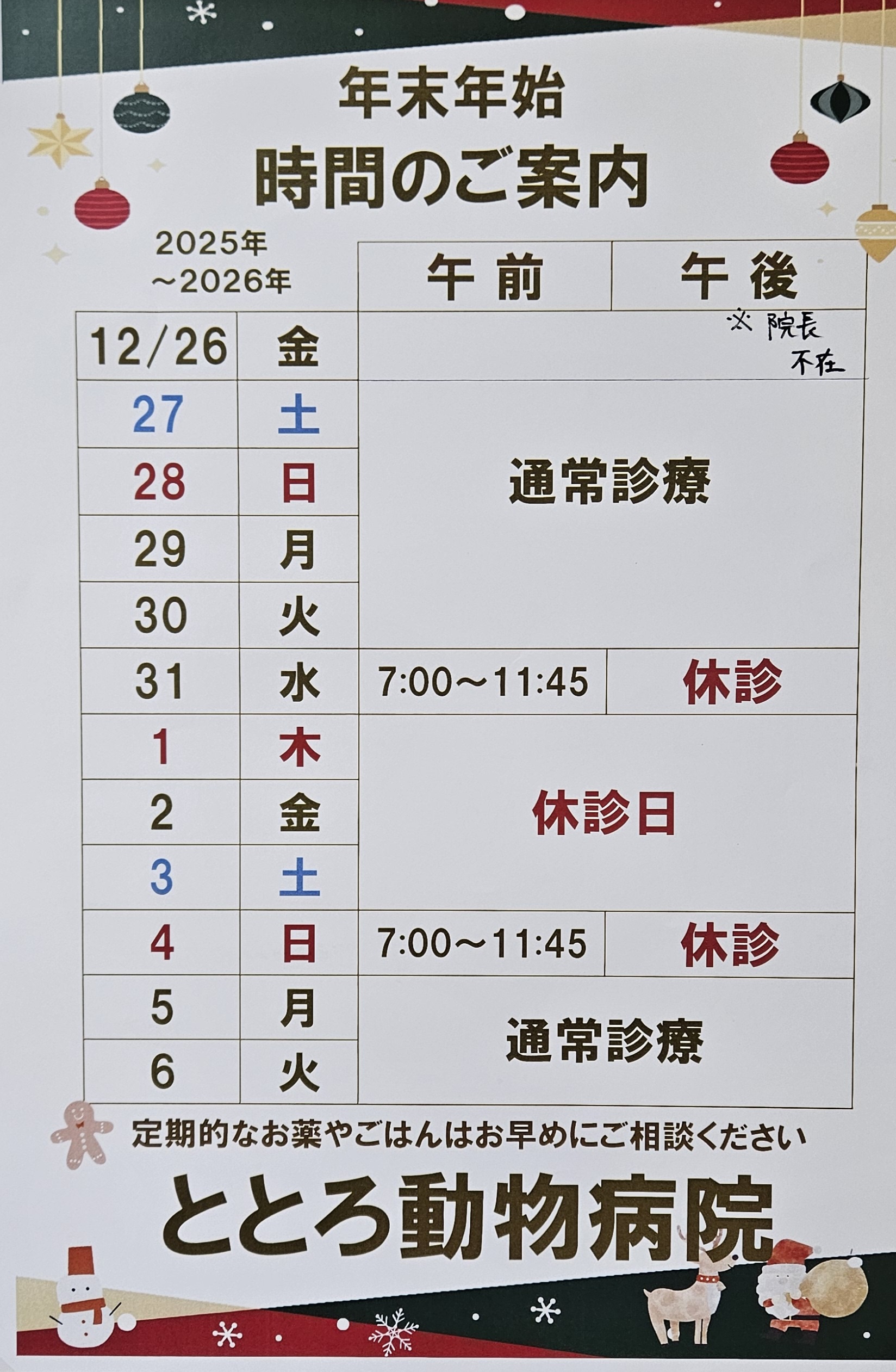年末は12/31(水) AM(7:00~11:45)まで、年始は1/4(日)より診察いたします。